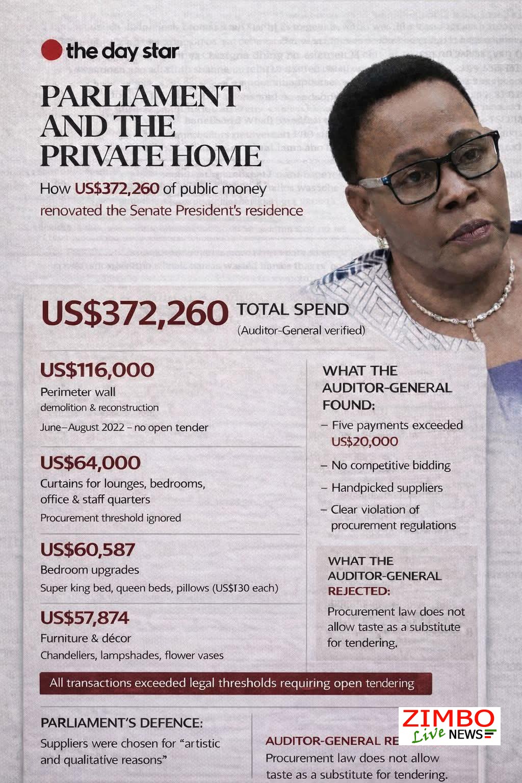 Zimbabwe’s Parliament has been thrust into the spotlight after revelations that nearly US$400,000 in public funds was allegedly used to upgrade the private home of Senate President Mabel Chinomona. The explosive findings show that the money went toward luxury household items, including curtains, beds, kitchen appliances, decorative vases, and flower pots—expenses that critics say have no clear link to official parliamentary duties.