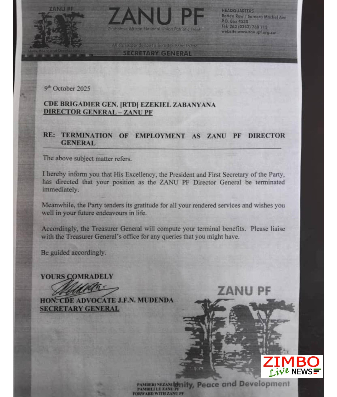 BREAKING NEWS: Mnangagwa Fires Another Military General from ZANU PF Post BREAKING: Mnangagwa Fires Another Military General from ZANU PF Post With Immediate Effect